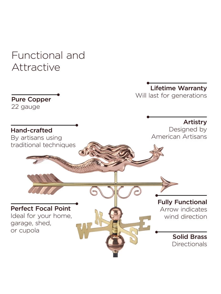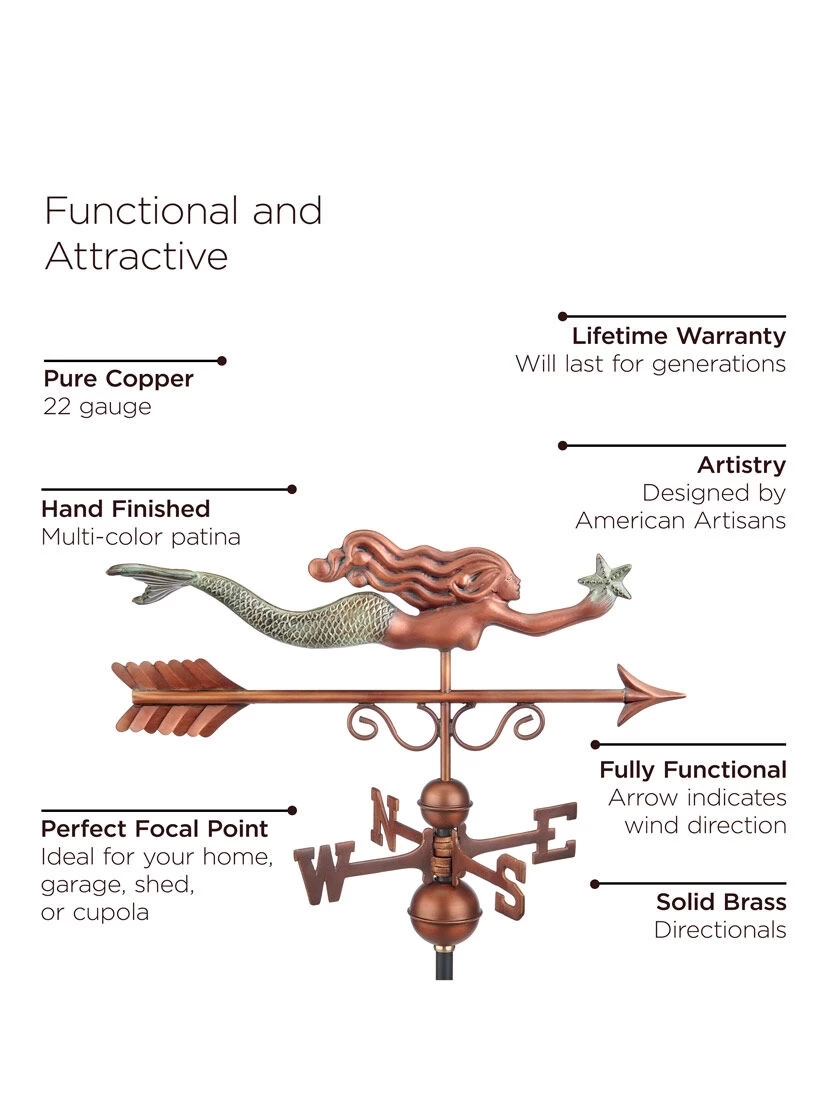 This mermaid couldn’t be happier to rise from the sea foam and adorn the rooftop of your home, garage, cupola, or gazebo. For over 35 years Good Directions Pure Copper Weathervanes have been unsurpassed in style, quality, and durability – perfect for the house-proud homeowner. Bring the Joy of Outdoor Living℠ to your home with this heirloom-quality piece. Easy-to-assemble and install. Includes weathervane figure, an assembly rod, solid brass 15″ L directionals and copper globes. Roof mount sold separately. The pure copper will age naturally over time.