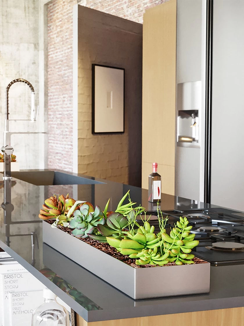 Low and sleek, the Geo Trough planter is the perfect addition to any table top, window sill or fireplace mantle. Crafted from a thick gauge, fully seam welded stainless steel base, the Geo planter is extremely versatile providing a unique look as kitchen accent or as a table top focal point. Whether planted with succulents, moss or even used as a vessel for candles, fruit or nuts, the Geo planter provides a sleek, modern look in all settings. All Geo Series planters are fully seam welded to prevent leakage. With a Veradek product you can rest assured that you are receiving the perfect balance of design, durability and convenience.