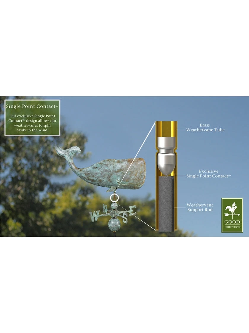 Thar he blows in the breeze! The largest mammal that ever lived, this whale design, circa 1860, is ready to adorn the rooftop of your home, garage, cupola, barn or gazebo. For over 35 years Good Directions pure copper weathervanes have been unsurpassed in style, quality, and durability – perfect for the house-proud homeowner. Weathervanes are easy-to-assemble and install. Includes an assembly rod, solid brass 18″L directionals, and copper globes. A 401AL Roof Mount is recommended to mount your weathervane to your rooftop, sold separately. The assembled size of this weathervane is 37”L x 34″H x 18″W. The figure-only size is 37″L x 16″H x 4″W. The beautiful Blue Verde? finish achieves the historic look of aged copper. Our exclusive Single Point Contact? design allows our weathervanes to spin easily in the wind. Bring The Joy of Outdoor Living? to your home with this heirloom-quality piece.